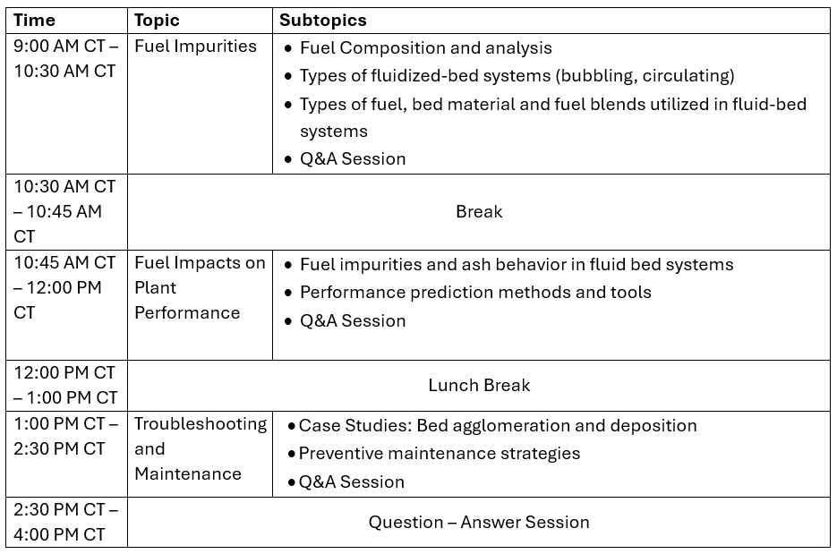 This workshop is tailored to equip participants with essential knowledge on the behavior of fuel impurities, enabling the reliable and efficient operation of the fluid bed systems.